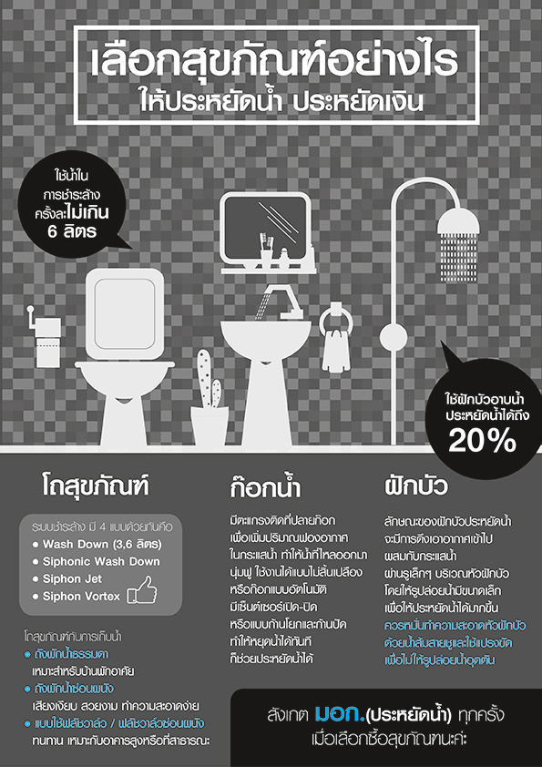 เลือกสุขภัณฑ์อย่างไรให้รู้ว่าประหยัด ก่อนตัดสินใจเลือกอุปกรณ์หรือสุขภัณฑ์รุ่นประหยัดน้ำ สังเกตง่ายๆ ที่ฉลากประหยัดน้ำที่ผ่านการรับรองจากสถาบันหรือองค์กรต่างๆ ไม่ว่าจะเป็น มอก.(ประหยัดน้ำ), ฉลากเขียว ตามด้วยการพิจารณาข้อมูลอัตราการใช้น้ำ ทดสอบการใช้งานให้แน่ใจแล้วจึงตัดสินใจเลือกรุ่นที่ถูกใจ