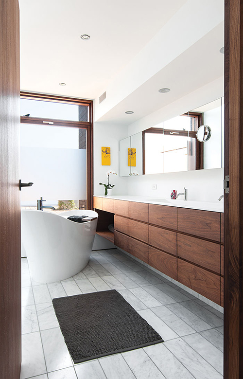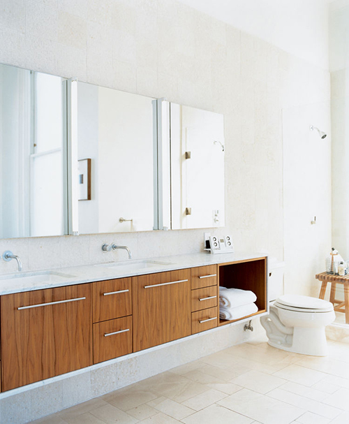 เคาน์เตอร์ห้องน้ำจากไม้วอลนัทสีเข้ม ตัดกับพื้นที่ปูด้วยกระเบื้องสีขาว เพิ่มความเท่แบบง่ายๆ ด้วยการติดกระจกยาว