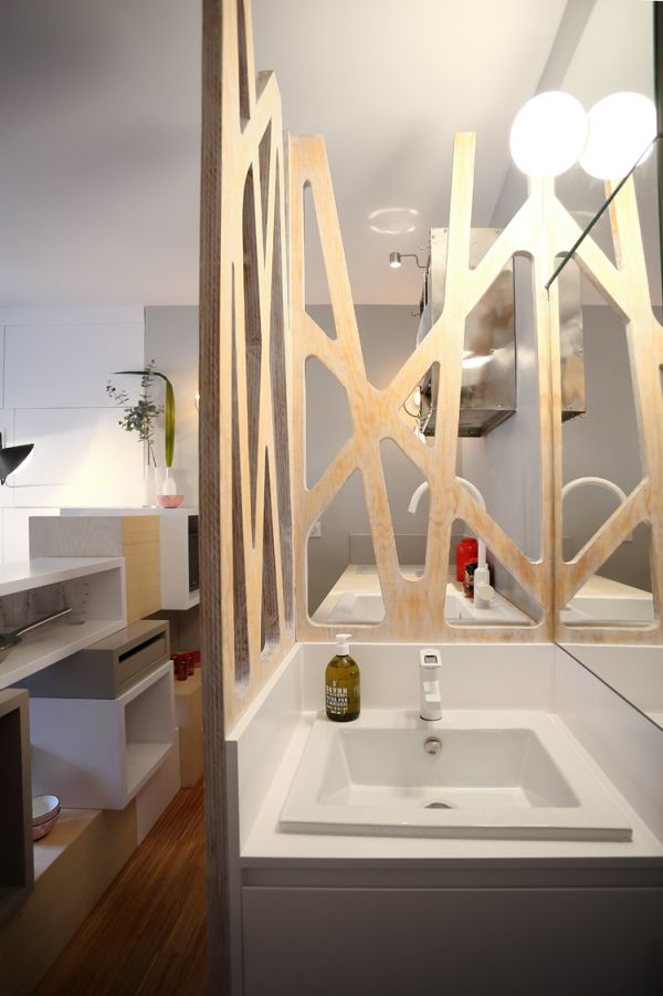 พื้นที่ระหว่าง "ห้องครัว" และ "ห้องน้ำ" ถูกแบ่งจากกันโดยใช้ฉากกั้นไม้แบบเท่ๆ