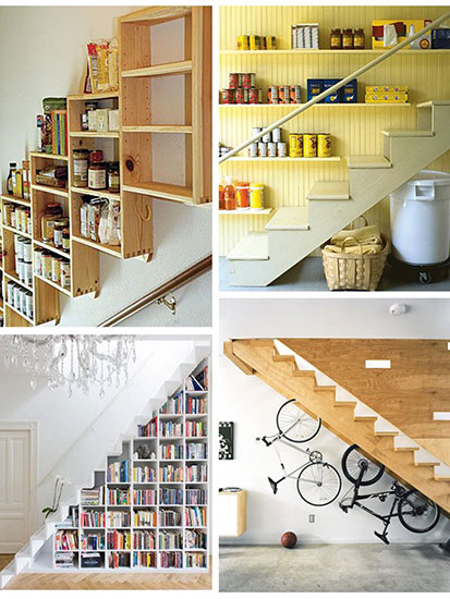 พื้นที่บริเวณบันไดเป็นอีกจุดหนึ่งที่นำมาใช้ประโยชน์ได้ ไม่ว่าจะเป็นด้านข้างบันได หรือใต้บันได ลองทำเป็นชั้นวางของโดยเล่นระดับตามขั้นบันได ก็จะได้ชั้นวางของเท่ๆ ที่ใช้ประโยชน์ได้จริง แถมยังดูมีลูกเล่น ไม่เปลืองพื้นที่อีกด้วย