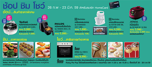 ศุกร์ เสาร์ อาทิตย์ ชอปสนุก ลุ้นรับรางวัลฟรี กริ๊ง… ช้อปฟรี เมื่อมีสัญญาณไฟ และเสียงดังที่แคชเชียร์ที่ท่านกำลังชำระเงิน รับฟรี บัตรของขวัญโฮมโปร มูลค่า 500 บาท ทั้งช้อปครบรับฟรีสูงสุด 43,000 บาท เฉพาะสมาชิกโฮมการ์ด ช้อปครบ 40,000 บาท รับฟรี บัตรของขวัญโฮมโปร มูลค่า 800 บาท ช้อปครบ 80,000 บาท รับฟรี Gift Card มูลค่า 2,500 บาท ช้อปครบ 120,000 บาท รับฟรีสร้อยคอทองคำ 1 สลึง มูลค่า 5,400 บาท ช้อปครบ 400,000 บาท รับฟรี Gift Card มูลค่า 22,000 บาท ช้อปครบ 700,000 บาท รับฟรี รถจักรยายนต์ยามาฮ่า รุ่น New GT125 มูลค่า 43,000 บาท ใบเสร็จมีค่าอย่าทิ้ง เมื่อซื้อสินค้า 10,000 บาทขึ้นไป รับทันที 500 บาท คูปองส่วนลดท้ายใบเสร็จ มูลค่า 100-200 บาท