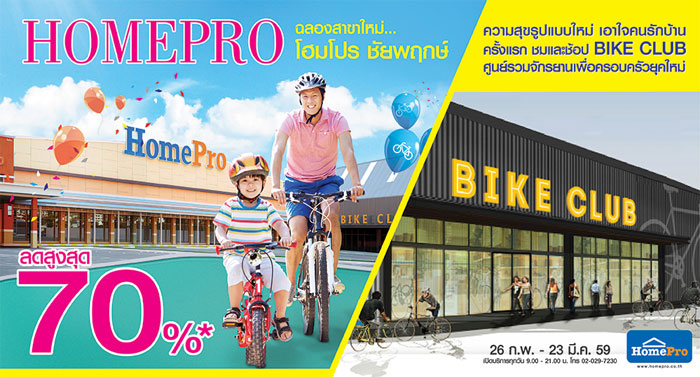 "โฮมโปร" เอาใจคนรักบ้านมุ่งตอบสนองไลฟ์สไตล์ลูกค้า เดินหน้าขยายสาขา "ชัยพฤกษ์" รับอานิสงส์การขยายตัวโครงการที่อยู่อาศัย และกำลังซื้อภายในย่าน สร้างความต่างพร้อมรับเทรนด์อนาคตด้วย Model room สินค้ากลุ่มผู้สูงอายุ มั่นใจศักยภาพการให้บริการ หวังโกยยอดขาย 80 ล้านบาทต่อเดือน พร้อมทุ่มอีกกว่า 45 ล้านบาท เปิดตัวธุรกิจใหม่ "Bike Club" ศูนย์รวมจักรยานแบรนด์ชั้นนำจากทั่วโลกที่ใหญ่ที่สุดในเอเชียตะวันออกเฉียงใต้ เพื่อเป็นศูนย์รวมของคนรักจักรยาน และสุขภาพที่แรกของประเทศไทย