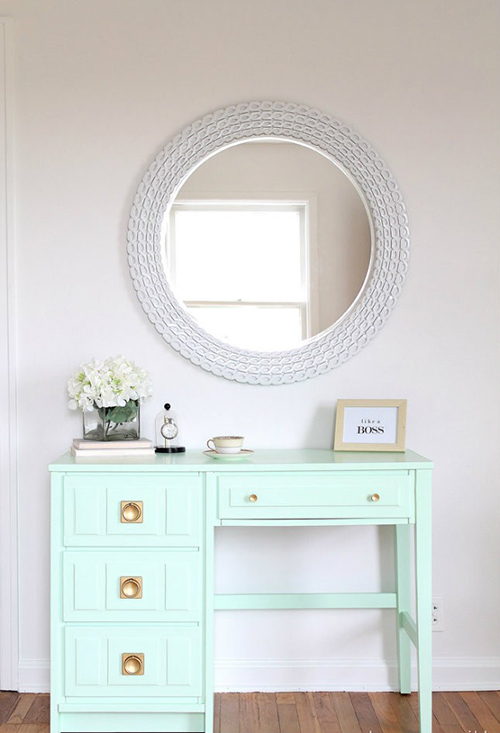 3. โต๊ะเขียวสีมินต์ กับกระจกทรงกลม หวานๆ แบบวินเทจ