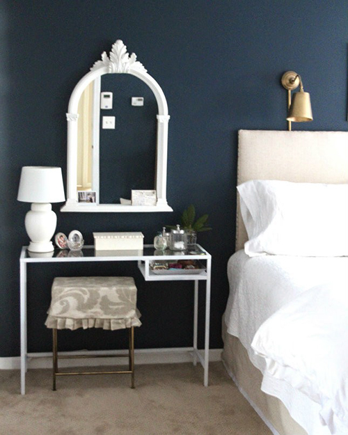 12. ผนังห้องสีเข้ม ตัดกับโต๊ะเครื่องแป้งสีขาว โต๊ะธรรมดาแต่ดีไซน์กระจกชนะเลิศ