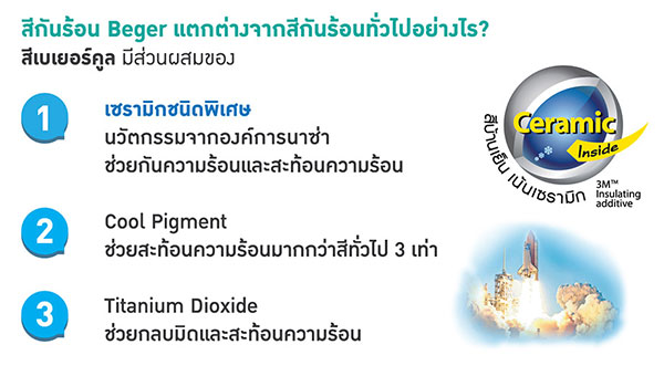 กลุ่มบริษัทสีเบเยอร์ ผู้นำนวัตกรรมสีรักษ์โลก รักคุณ ขนกองทัพ "สี" ทั้งงานปูนและงานไม้ พร้อมไอเดียเติมแต่งต่างๆ มากมายให้ได้ทดลองสร้างสรรค์จินตนาการ ด้วยตัวคุณเอง และไฮไลท์พิเศษตัวช่วยคลายร้อนกับนวัตกรรมสีทาบ้านเย็น เบเยอร์คูล (Beger Cool) สีทาบ้านกันความร้อนรายแรกในเมืองไทย ที่มีส่วนผสมไมโครสเฟียร์เซรามิก (Microsphere Ceramic) ซึ่งเป็นวัสดุมาตรฐานเช่นเดียวกับองค์การนาซ่า ที่นำมาใช้ป้องกันความร้อนให้กับกระสวยอวกาศ ซึ่งมีคุณสมบัติพิเศษ ช่วยสะท้อนแสงแดดได้กว่า 94.2% ทำให้บ้านเย็นสบายและประหยัดพลังงาน สามารถลดอุณหภูมิให้บ้าน 3-5 องศา และจะทำให้ช่วยประหยัดไฟได้ถึง 25%