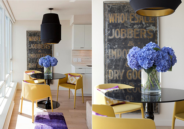 ใช้สีเหลืองเพิ่มความสดใส ดึงดูดสายตาด้วยแจกันดอกไฮเดรนเยียสีม่วง