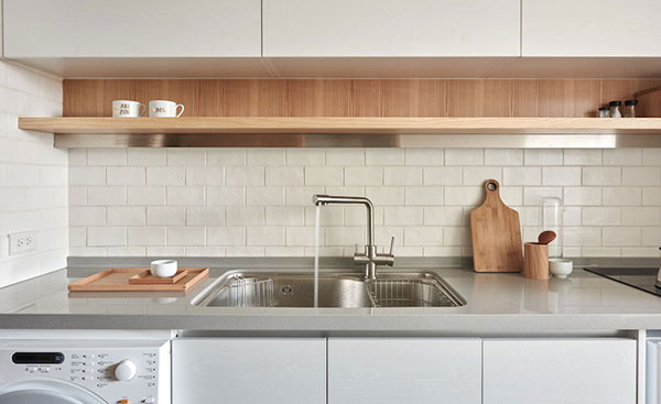 ด้านบน Pantry ออกแบบให้มีชั้นวางของยาวติดผนัง เพื่อเพิ่มพื้นที่การใช้งานให้ส่วนครัว