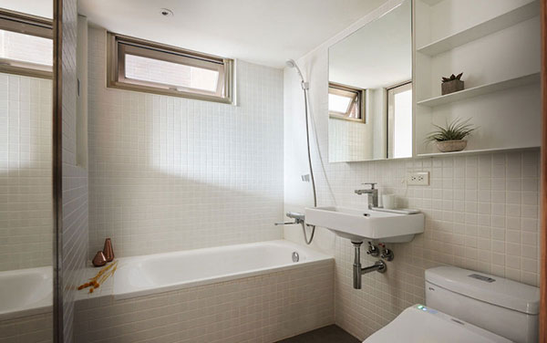 กระจกติดผนังบานใหญ่ช่วยเพิ่มความรู้สึกให้พื้นที่ในห้องน้ำดูกว้างขวางมากขึ้น