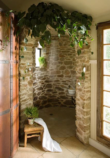 นอกจากผนังที่ก่อด้วยหินแล้ว ยังเพิ่มความเขียวขจีด้วยต้นไม้เล็กๆ หลายจุดในห้องอาบน้ำ
