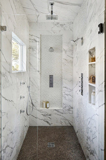ห้องอาบน้ำโทนสีขาว-เทา-ดำ ที่เลือกตกแต่งผนังด้วยหินอ่อน แบ่งสัดส่วนพื้นที่เปียกด้วย Shower Box