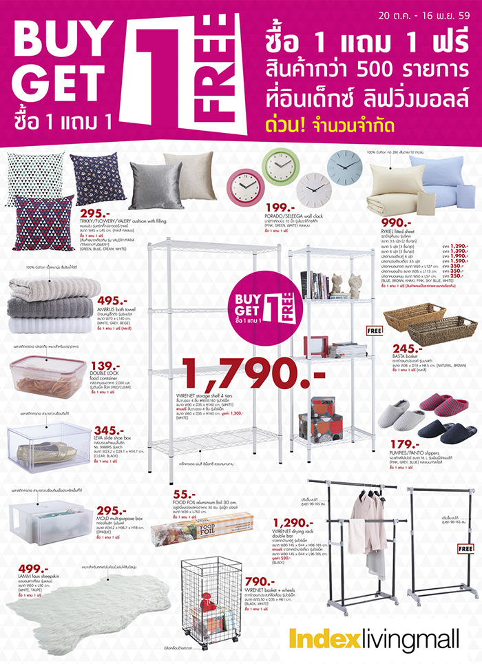 โปรเด็ด น่าโดน! จาก Index Living Mall ซื้อ 1 ชิ้น ฟรีอีก 1 ชิ้น กับเฟอร์นิเจอร์และของแต่งบ้านหลากสไตล์กว่า 500 รายการ พบกันที่ Index Living Mall ทั้ง 26 สาขาทั่วประเทศ ตั้งแต่ 20 ต.ค. - 16 พ.ย. 59 นี้เท่านั้น สินค้ามีจำนวนจำกัดนะคะ