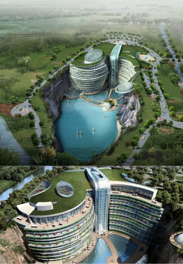 Shimao Quarry โรงแรมหรูที่สร้างอยู่ในหลุม! ประเทศจีน ออกแบบโดย Atkins Global ปี 2015