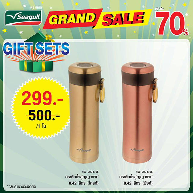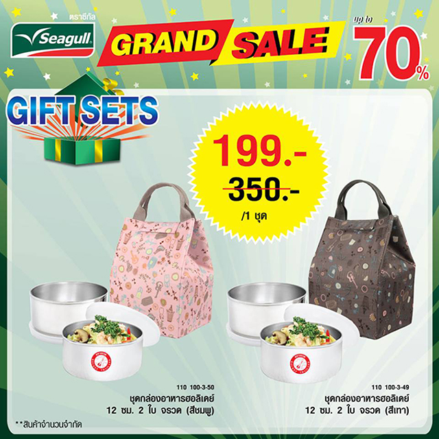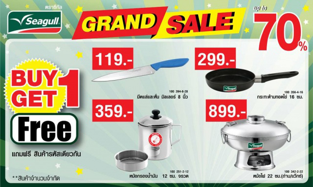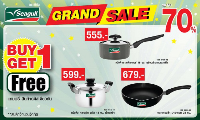 พบกับมหกรรมลดราคาเครื่องครัวครั้งยิ่งใหญ่แห่งปี "Seagull Grand Sale 2016" เครื่องครัว "ซีกัล" และ "จรวด" ยกขบวนสินค้ากว่า 500 รายการ มาลดราคาพิเศษ ซื้อ 1 แถม 1 และลดสูงสุดถึง 70%
