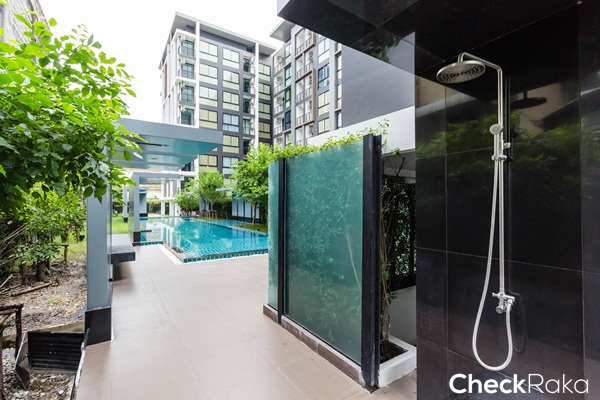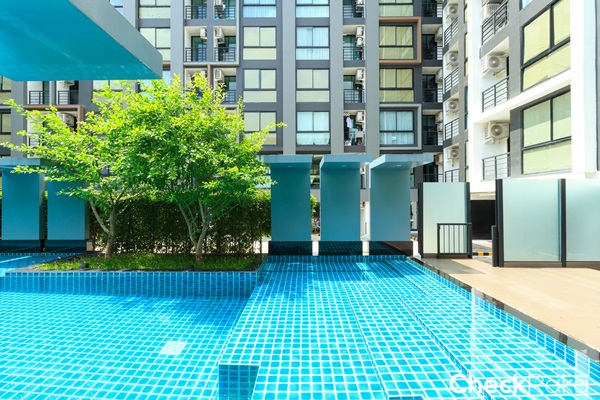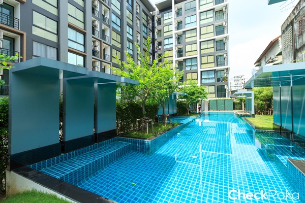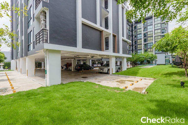 พื้นที่สำหรับจอดรถกลางแจ้ง ทางซ้ายมือเป็นสระว่ายน้ำส่วนกลาง ส่วนทางขวามือเป็นพื้นที่จอดรถใต้อาคาร