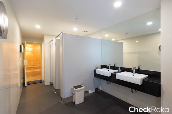 ในห้องน้ำได้ไฟดาวน์ไลท์ทรงกลม 2 ดวง พร้อมเครื่องดูดอากาศ