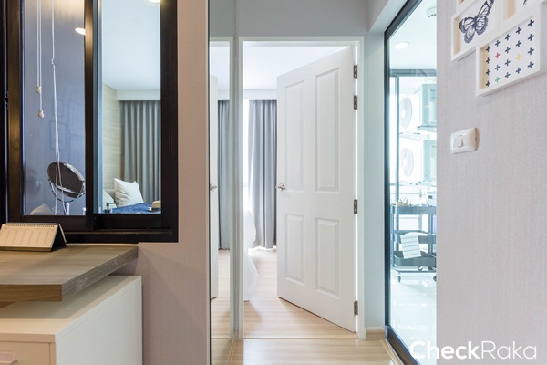 ประตูทางเข้าห้องเป็นประตูลายไม้ มือจับแบบการโยก พร้อมช่องมองตาแมว