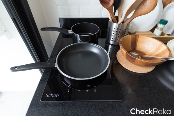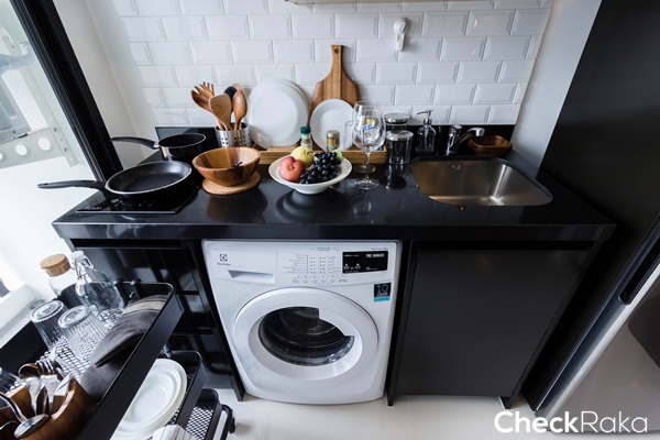 หน้าท็อปเคาน์เตอร์ครัวเป็นหินเทียมสีดำ มีที่วางเครื่องซักผ้าแบบฝาหน้าขนาด 8 กก. ใต้เคาน์เตอร์