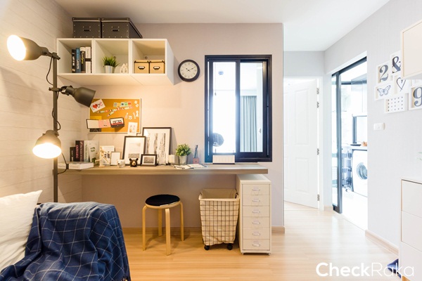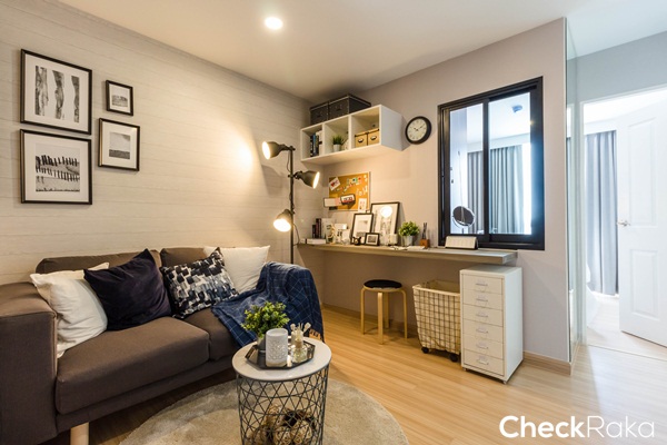 ฝั่งขวาของห้องนั่งเล่นทางโครการ Built-in เป็นโต๊ะอเนประสงค์ยาวตลอดแนวผนังมาให้ เป็นการช่วยประหยัดพื้นที่จะเป็นทำมุมทำงานหรือทุมทานอาหารก็ได้ (แต่วัสดุปิดผิวของจริงจะเป็นสีขาว ไม่ใช่ลามิเนตแบบนี้นะคะ)