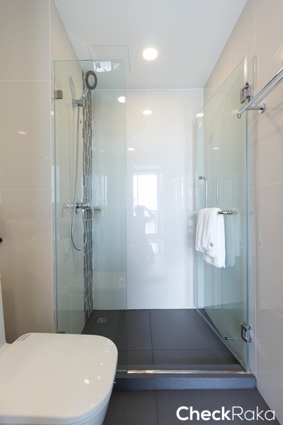 ได้ฉากกั้นอาบน้ำเป็นกระจก Tempered Glass ยี่ห้อ ShowerKing ประตูเป็นบานสวิงเปิดเข้าด้านใน มือจับรูปตัว U
