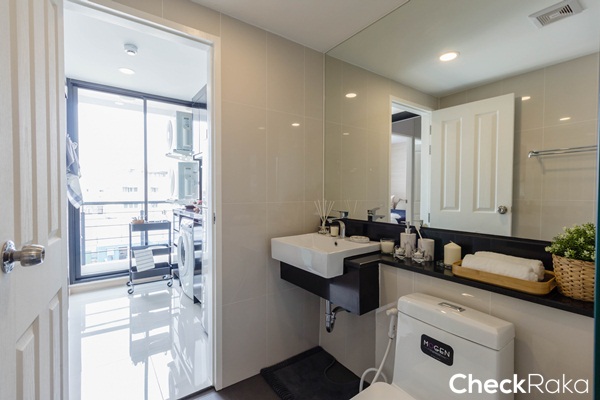 อ่างล้างหน้าทรงสี่เหลี่ยม ทางโครงการก่อเคาน์เตอร์สีดำเพิ่มพื้นที่สำหรับวางอุปกรณ์อาบน้ำ