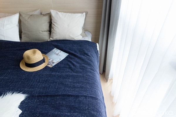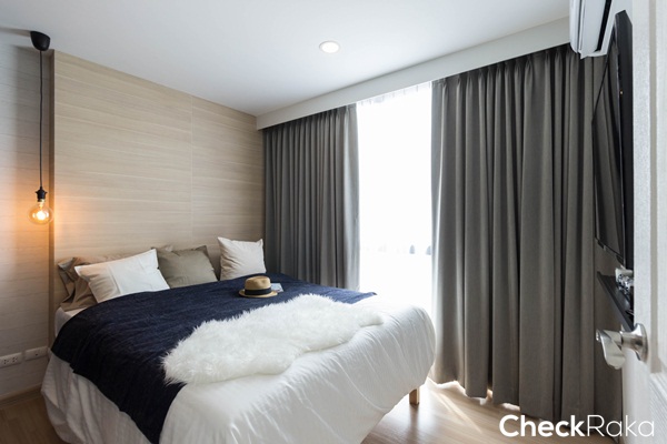 พื้นที่ข้างเตียงถึงตู้เสื้อผ้าเหลือประมาณ 90 ซม. สามารถวางโต๊ะข้างเตียงขนาดเล็กๆ ได้ 1 ตัว