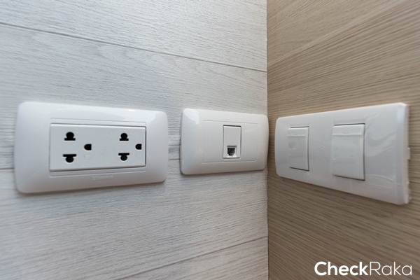 ข้างเตียงติดตั้ง ปลั๊ก สวิตช์ และช่องเสียบสายโทรศัพท์พลาสติกสีขาวของ Bticino ไว้ให้