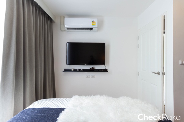 ได้แอร์ Samsung 1 เครื่องติดตั้งไว้ที่ผนังปลายเตียง สำหรับใครที่ชอบดูทีวี หาทีวีมาติดไว้ทีผนังแบบนี้ก็ได้นะคะ