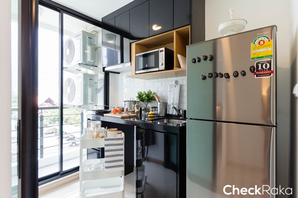 ห้องครัวแบ่งเป็นสัดส่วนด้วยประตูบานเลื่อนกรอบอลูมิเนียมสีดำ รางประตูเป็นแบบแขวนทำความสะอาดง่าย