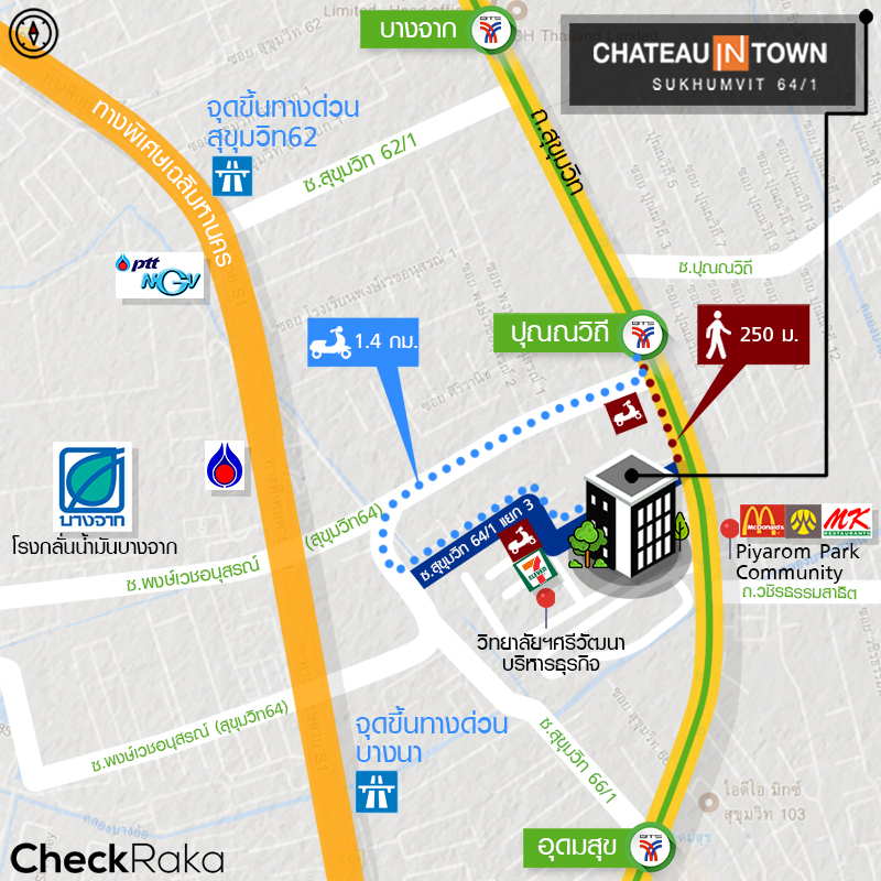วันนี้ CheckRaka.com จะพาไปเยี่ยมชมคอนโด ชาโตว์ อินทาวน์ สุขุมวิท 64/1 (Chateau in Town Sukhumvit 64/1) คอนโดมิเนียมพร้อมอยู่สไตล์โมเดิร์นจากบริษัท พระยาพาณิชย์พร็อพเพอร์ตี้ จำกัด ในเครือ CMC GROUP สำหรับโครงการนี้เป็นคอนโด Low-Rise สูง 8 ชั้น ที่มาภายใต้คอนเซปต์ "EXPAND YOUR LIFE" ขยายชีวิต ให้ใกล้อนาคต ตั้งอยู่ภายในซอยสุุขุมวิท 64/1 ใกล้รถไฟฟ้า BTS สถานีปุณณวิถี เพียง 250 เมตร และไม่ไกลจากทางขึ้น-ลงทางด่วน สุขุมวิท 62 ปัจจุบันโครงการสร้างแล้วเสร็จพร้อมให้ลูกบ้านเข้าอยู่แล้ว เดี๋ยวเราจะไปชมห้องจริงบรรยากาศจริงของโครงการนี้กันเลยค่ะ