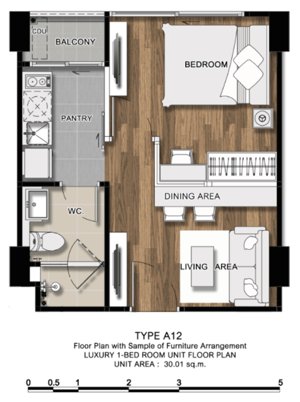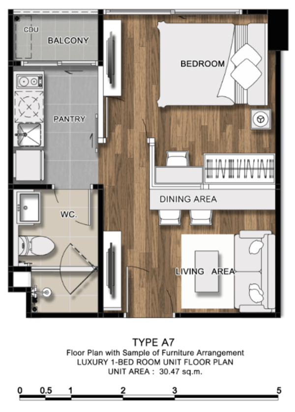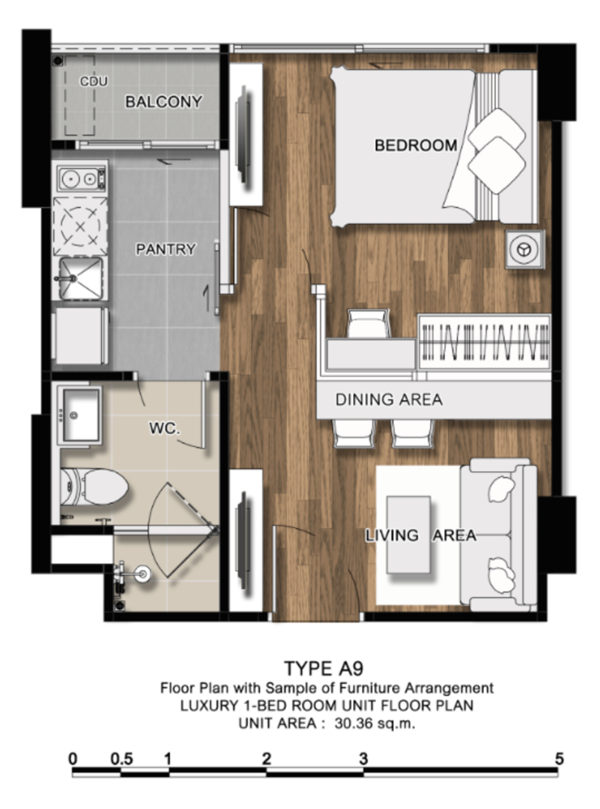 ภาพห้องตัวอย่างแบบ 1 ห้องนอน ขนาด 38.29 ตร.ม.