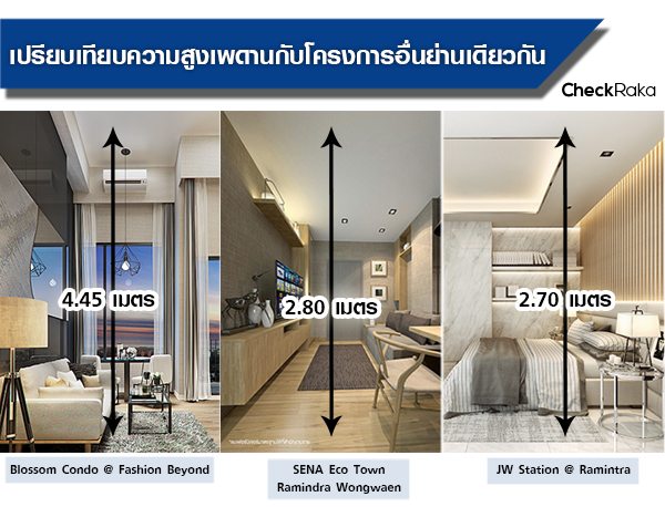 ในบรรดาคอนโดมิเนียมย่านรามอินทราน้อยมากที่เราจะพบเห็นคอนโด High-Rise แน่นอนว่า บลอสซั่ม คอนโด แอท แฟชั่น บียอนน์ เป็นโครงการเด่นโครงการหนึ่งที่ตั้งตระหง่านในย่านนี้ จุดเด่นเลยก็คือโครงการมีเพดานสูงถึง 4.45 เมตร ดังนั้นจึงทำให้ความสูงของโครงการที่มี 19 ชั้นเทียบเท่ากับโครงการอื่นๆ ที่สูง 30 ชั้น ทำให้เห็นวิวที่เหนือว่าและสูงกว่าโครงการปกติค่ะ