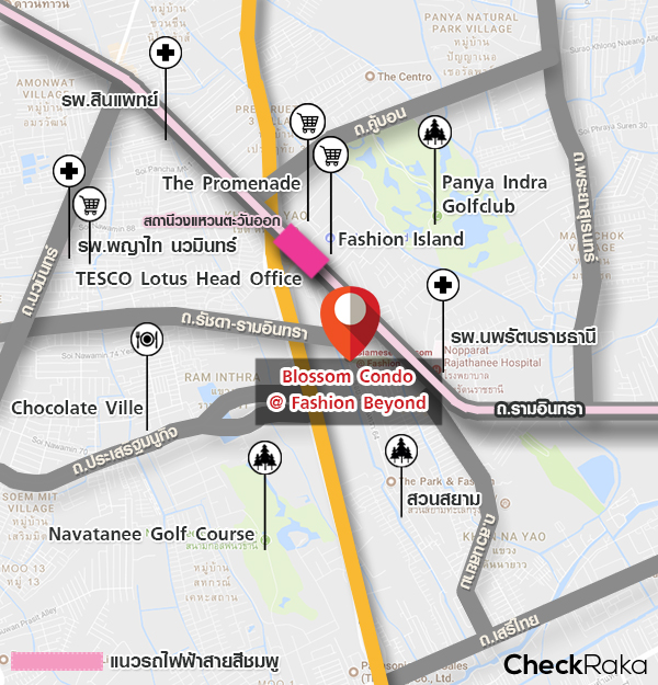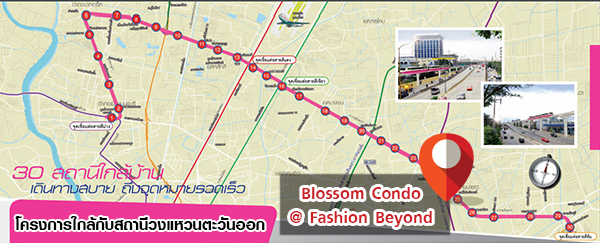 แผนที่โครงการ บลอสซั่ม คอนโด แอท แฟชั่น บียอนน์ ใกล้กับรถไฟฟ้าสายสีชมพู สถานีวงแหวนตะวันออก