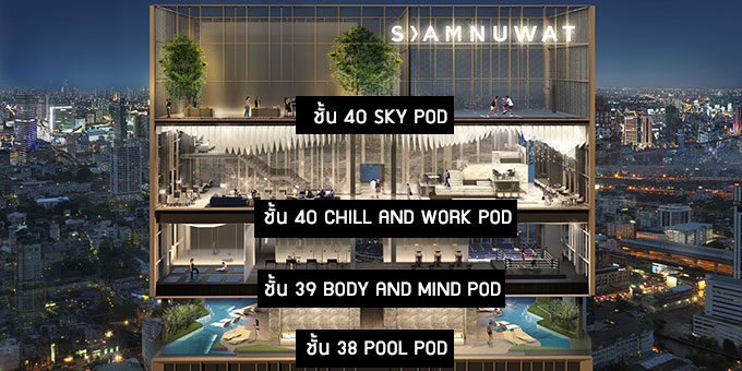 - จุดเด่น : Lifestyle Pods 4 ชั้นบนสุดของตัวอาคาร