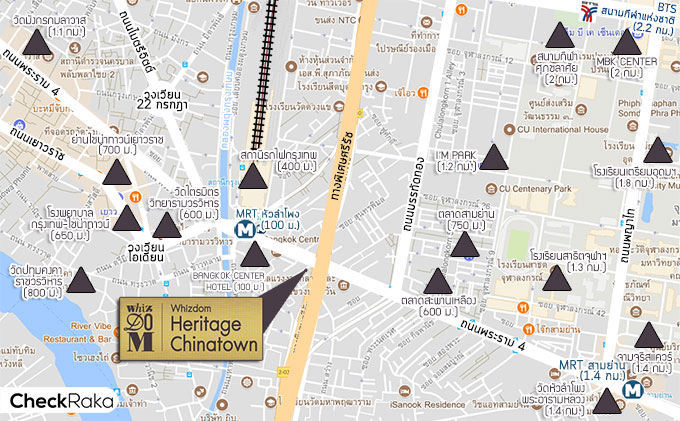 วิสซ์ดอม เฮอร์ริเทจ ไชน่าทาวน์ (Whizdom Heritage Chinatown) จาก แมกโนเลีย MQDC ตั้งอยู่บนถนนพระราม 4 ห่างจาก MRT สถานีหัวลำโพงประมาณ 100 เมตร และห่างจากย่านไชน่าทาวน์เยาวราช ประมาณ 700 เมตร เท่านั้น สำหรับข้อมูลโครงการ ตอนนี้ยังไม่มีรายละเอียดจากทาง MQDC ค่ะ