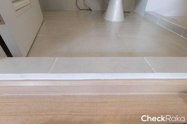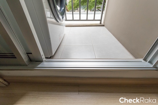 ธรณีระเบียงยกสูงประมาณ 10 ซม. ส่วนพื้นระเบียงปูด้วยกระเบื้องเซรามิก