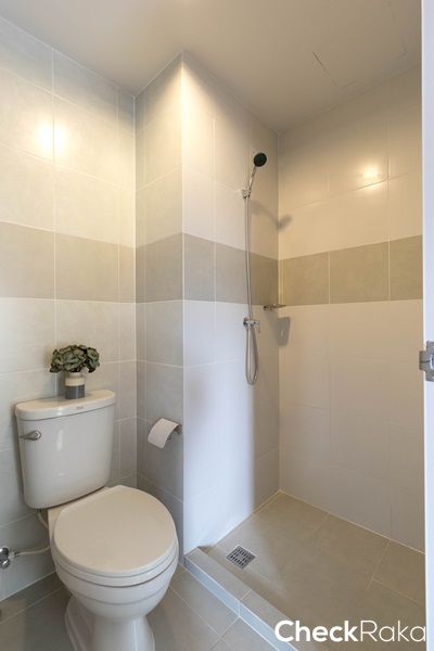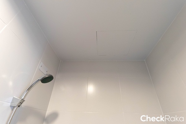ประตูห้องน้ำวัสดุเป็น PVC สำเร็จรูปขนาด 0.70 x 2.00 ม. ลดระดับฝ้าเพดานลงมาเล็กน้อยอยู่ที่ประมาณ 2.4 ม.