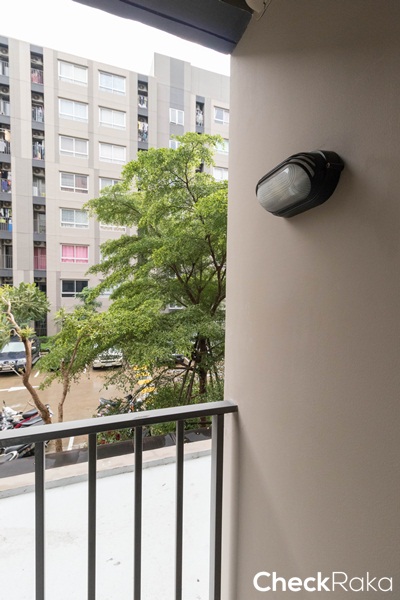 ที่ผนังติดโคมไปรูปทรงวงรีแบบนี้มาให้ 1 ดวง ส่วนราวระเบียงกันตกสูงประมาณ 110 ซม. (ตั้งแต่ชั้น 2-8)