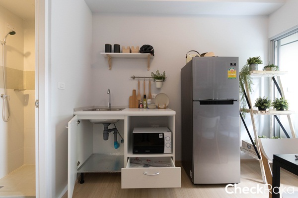 ถัดจากเคาน์เตอร์ครัวเหลือพื้นที่สำหรับวางตู้เย็น และชั้นวางของหรือวางเป็นตู้สำหรับเก็บของได้อีกนิดหน่อย