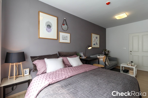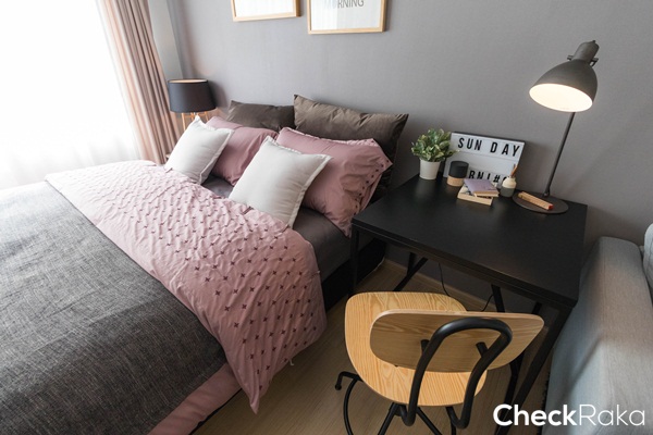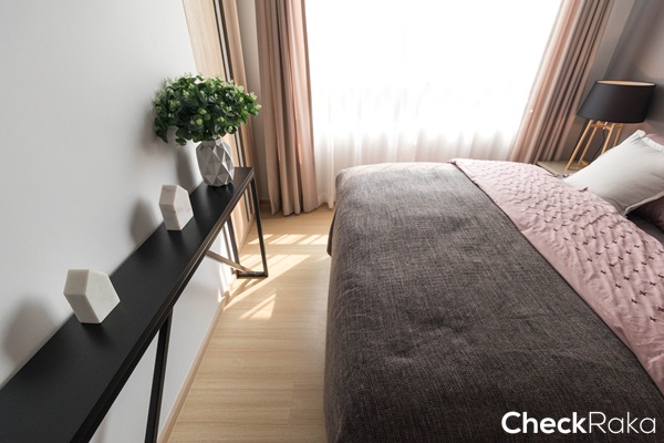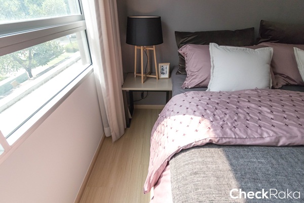 ทางโครงการวางเตียงนอนขนาด 5 ฟุตมาให้ดู เหลือพื้นที่สำหรับวางโต๊ะข้างเตียงเล็กๆ