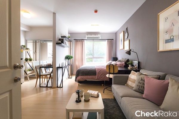 ภาพห้องตัวอย่างแบบ Studio ขนาด 26.39 ตร.ม. (ตกแต่งโทนสีชมพู)