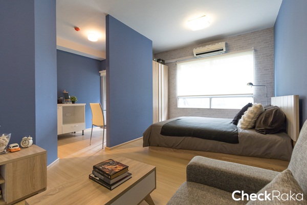 ห้องนี้ขยับโซฟา และเตียงนอนวางชิดผนังทำให้พื้นที่ตรงกลางห้องดูกว้างมากกว่าห้องที่แล้ว