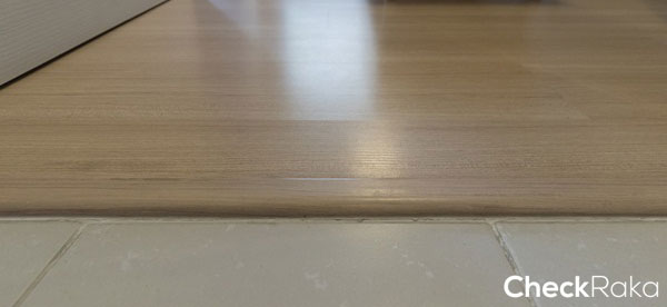 พื้นห้องปูด้วยลามิเนตลายไม้หนา 8 มม. เรียบเสมอกับโถงทางเดิน