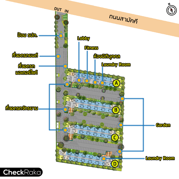 - ที่จอดรถ : ที่จอดรถ 24% (ไม่รวมจอดซ้อนคัน) หรือ 30% แบบรวมจอดซ้อนคัน