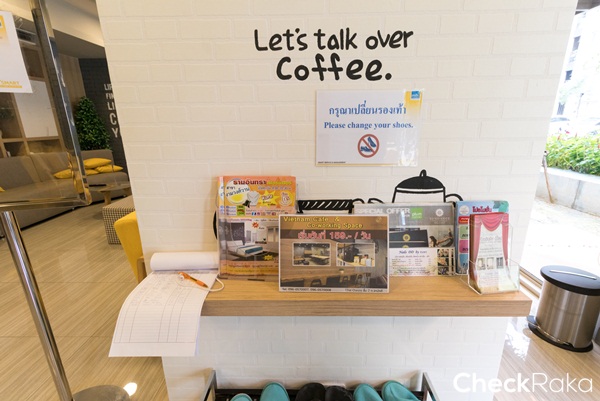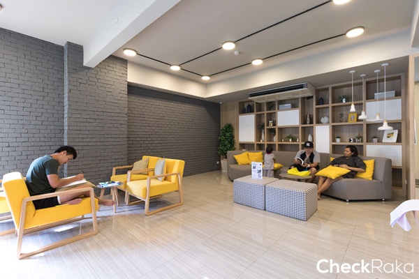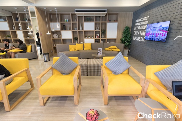 บรรยากาศภายในล็อบบี้ ตกแต่งด้วยโทนสีเทาเหลือง พร้อมบริการฟรี Wi-Fi ให้ลูกบ้านนั่งทำงาน ฟังเพลงในนี้ได้