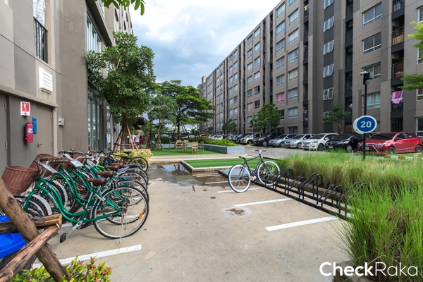 แต่ละอาคารจะมีพื้นที่สำหรับจอดรถจักรยานไว้ให้