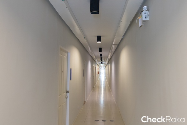 โถงทางเดินกว้างประมาณ 1.5 เมตร ปูพื้นด้วยกระเบื้องสีครีมขนาด 30 x 30 ซม.