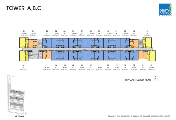 - 1C: Studio ขนาด 28.00 ตร.ม. ราคาเริ่มต้น 869,000 บาท