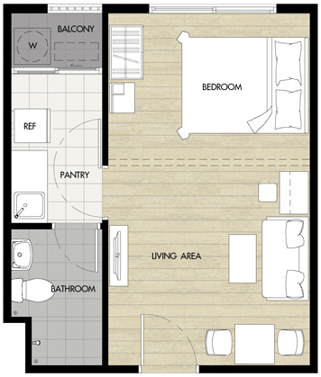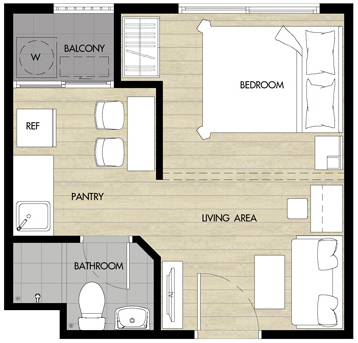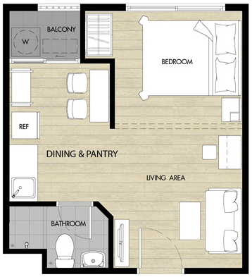 - ห้องแบบ Studio Type 1A: ขนาด 22.82 ตร.ม.