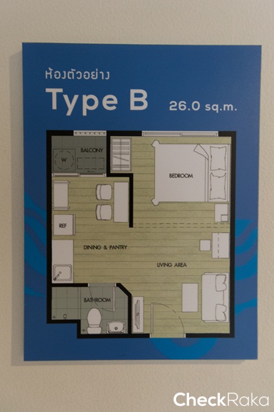ส่วนห้องตัวอย่างที่จะพาไปดูกันในวันนี้เป็นห้องจริงที่อยู่บนชั้น 1 และชั้น 2 ของอาคาร A โดยทางโครงการจัดไว้ให้ดู 2 ห้องด้วยกัน เป็นห้องแบบ Studio ขนาด 26.39 ตร.ม. และ 22.82 ตร.ม. ตามเราไปดูทีละห้องกันเลยค่ะ เริ่มจากห้องแรก