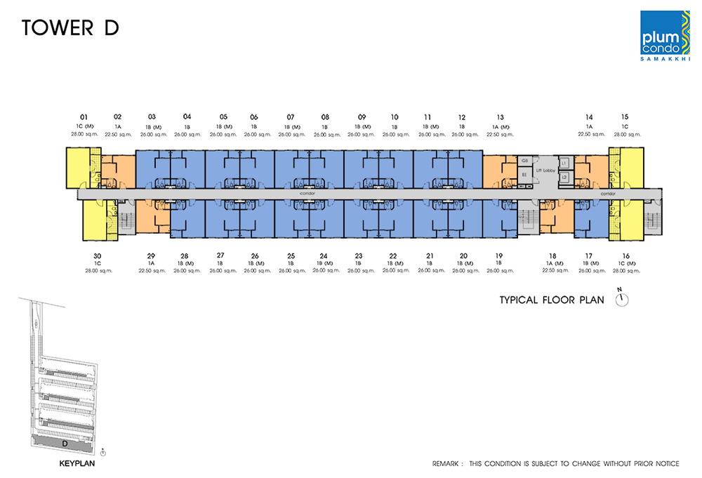 ชั้น 2-8 อาคาร D : จะเหมือนกันคือมียูนิตพักอาศัยชั้นละ 30 ยูนิต แบ่งเป็นห้องขนาด 22.82 ตร.ม. จำนวน 3 ยูนิต ,ห้องขนาด 26.39 จำนวน 25 ยูนิต และห้องขนาด 28.00 ตร.ม. อีก 2 ยูนิต